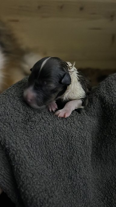 Am frühen Morgen (13.01.2025) gegen 4 Uhr begannen die ersten Wehen. Um 6 Uhr setzten die Presswehen ein, und kurz nach 7 Uhr kam der erste Welpe zur Welt. Die Geburt verlief problemlos und dauerte insgesamt etwa drei Stunden.